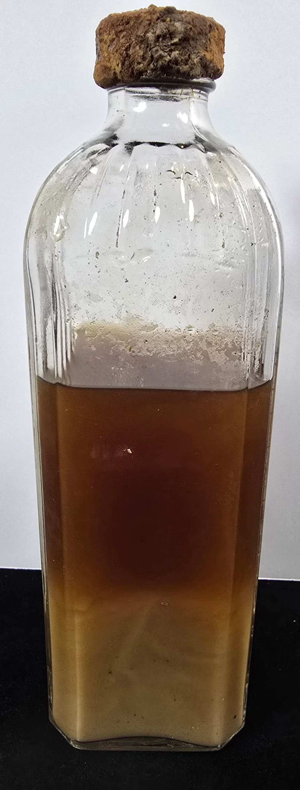 The bottle is intact with no cracks or chips. Embossing remains strong and legible. The cork is degraded and discolored. Contents have separated into layers, showing evidence of chemical breakdown over time.
