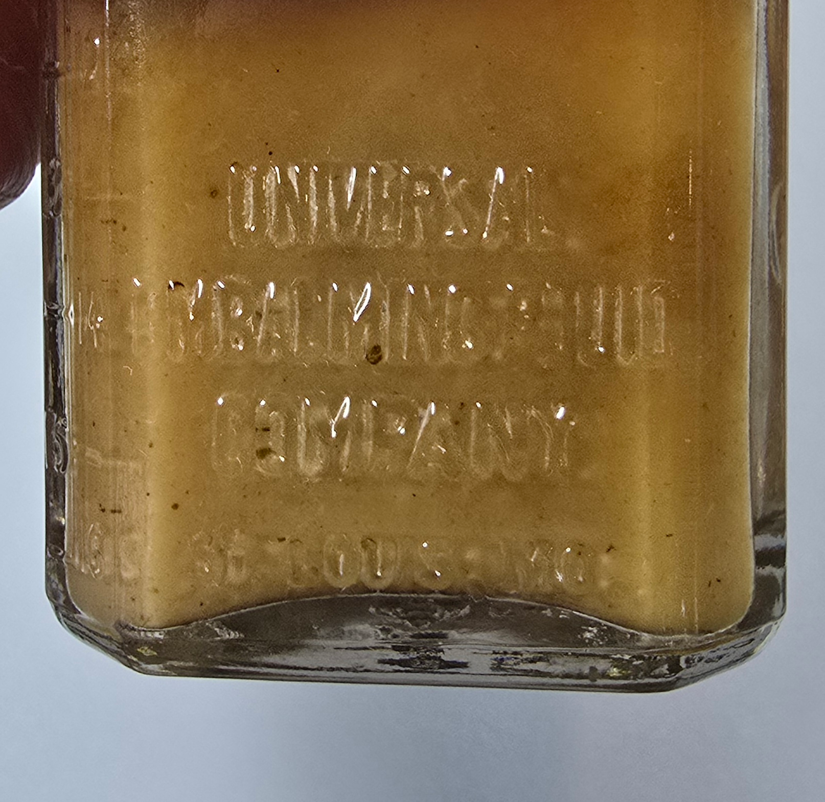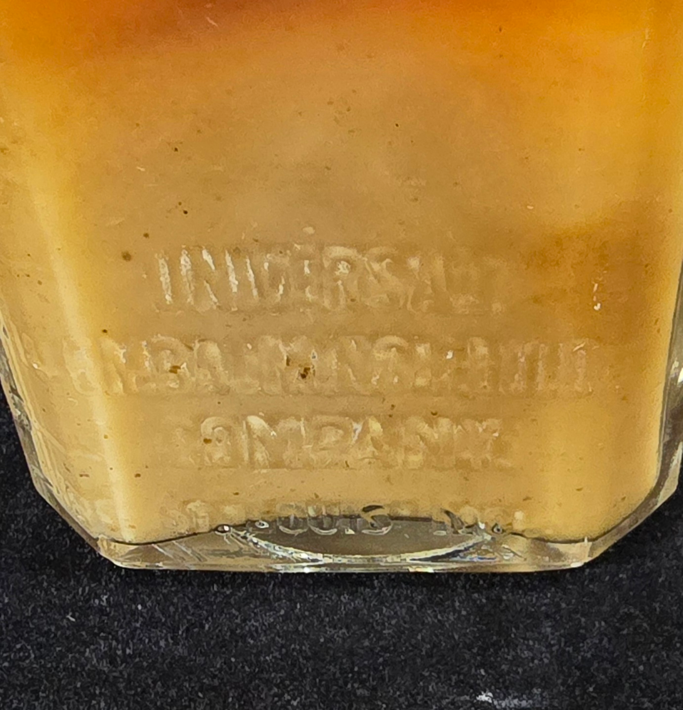 This antique bottle, embossed with “Universal Embalming Fluid Company – St. Louis, MO”, once contained embalming fluid. The liquid inside has partially separated, with sediment settling at the bottom and a darker layer above. The cap remains in place, though corroded and showing significant age. Such fluids often contained dangerous preservatives including arsenic (in earlier periods) or formaldehyde mixtures (after the early 1900s).