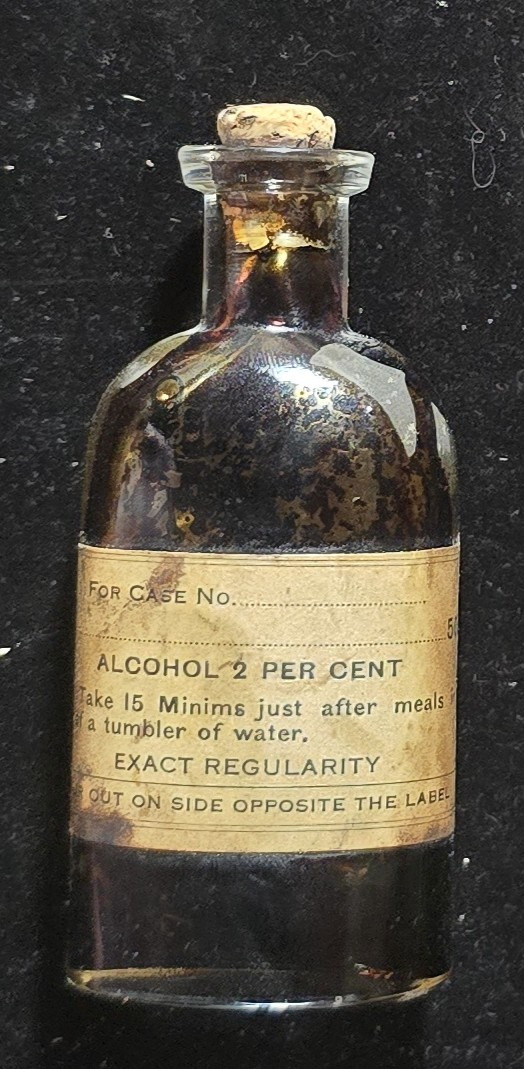 Vintage prescription bottle labeled Alcohol 2 Percent with cork stopper and dosage instructions