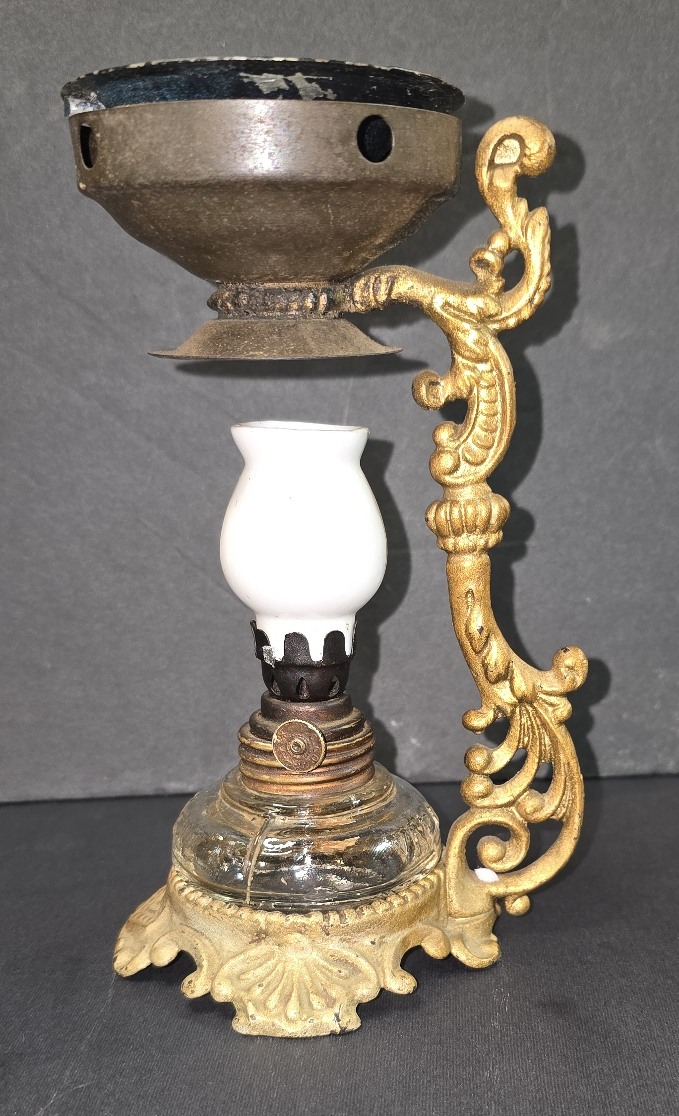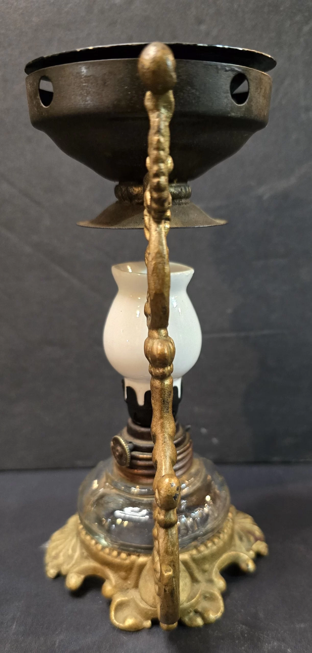 This example retains its ornate cast-metal frame and original burner assembly, with the removable bowl and wick components intact.