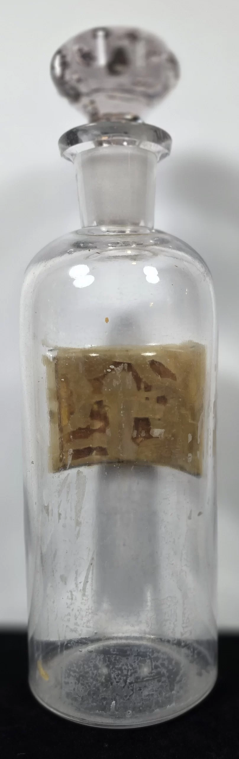 This clear glass apothecary bottle with ground glass stopper is labeled VIN. ANTIM., the Latin abbreviation for Vinum Antimonii—Antimonial Wine. This preparation consisted of wine infused with tartar emetic (antimony potassium tartrate), once widely prescribed as an expectorant, diaphoretic, and emetic. It was thought to induce sweating and vomiting, believed to help purge illness from the body.