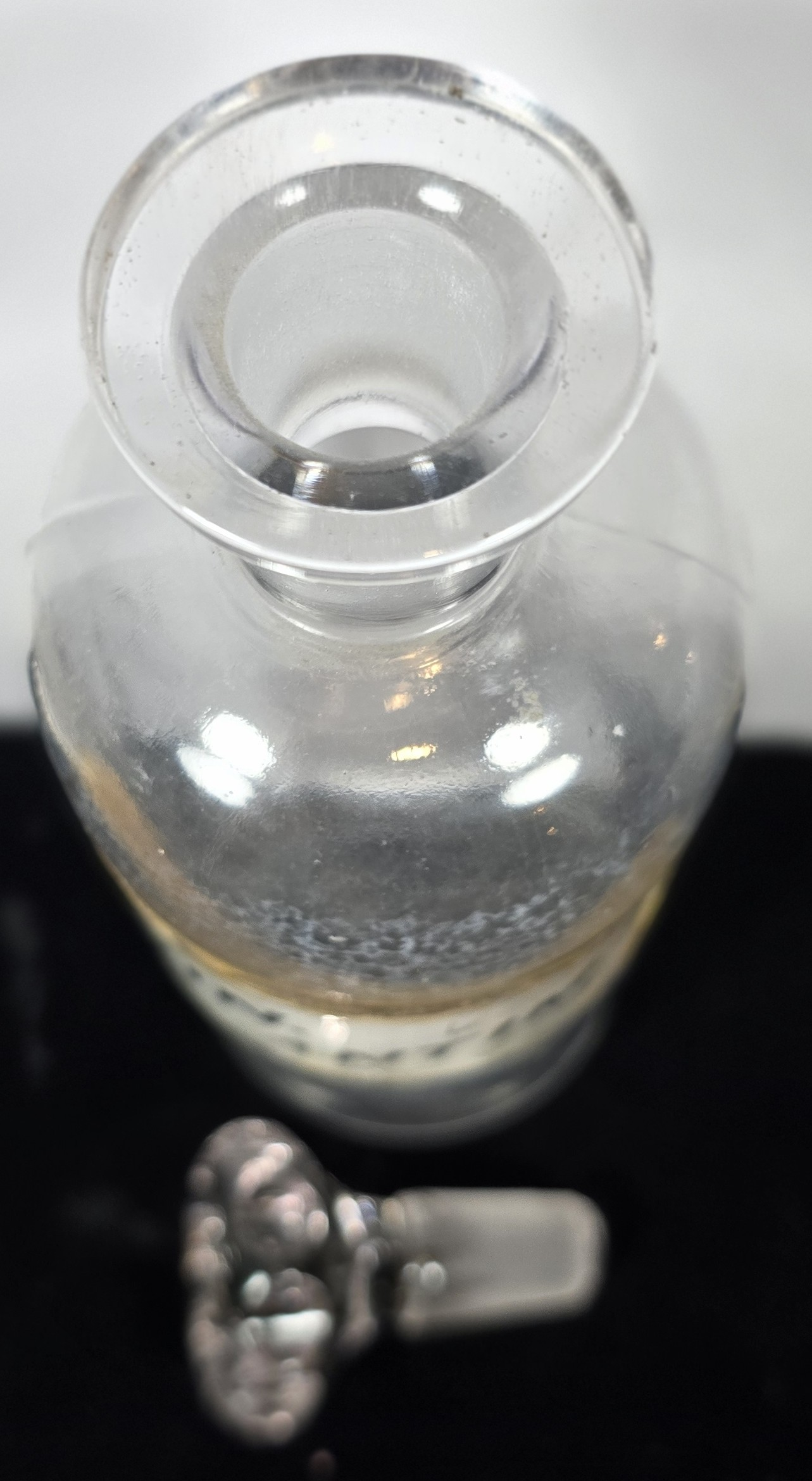 Bottle and stopper in good condition with some internal residue and wear. Label shows staining and aging but remains legible.