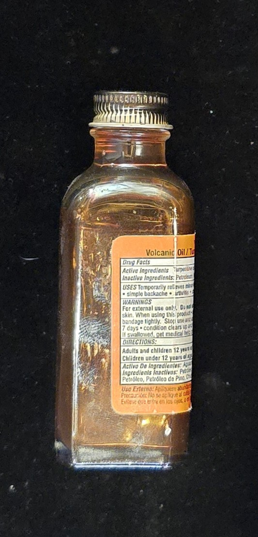 Turpentine oil liniments have been used since the 19th century as counterirritants—substances applied to the skin to produce mild inflammation and increase blood flow, with the goal of relieving deeper muscular or joint pain. “Volcanic Oil” was a brand name historically associated with patent medicines, often blending turpentine with herbal and aromatic oils. While early versions were unregulated and sometimes contained strong irritants, modern formulations are controlled under FDA labeling and safety requirements.