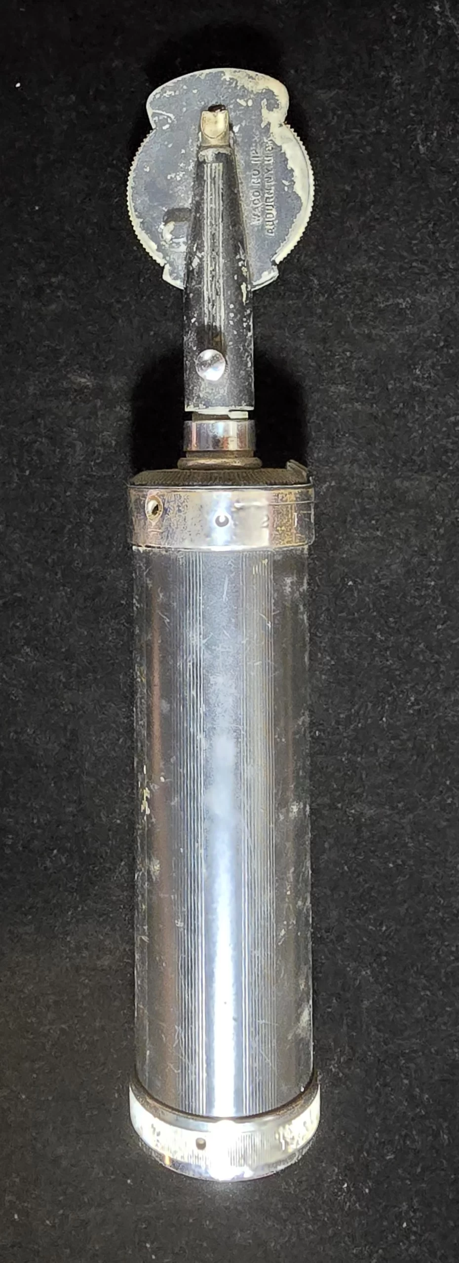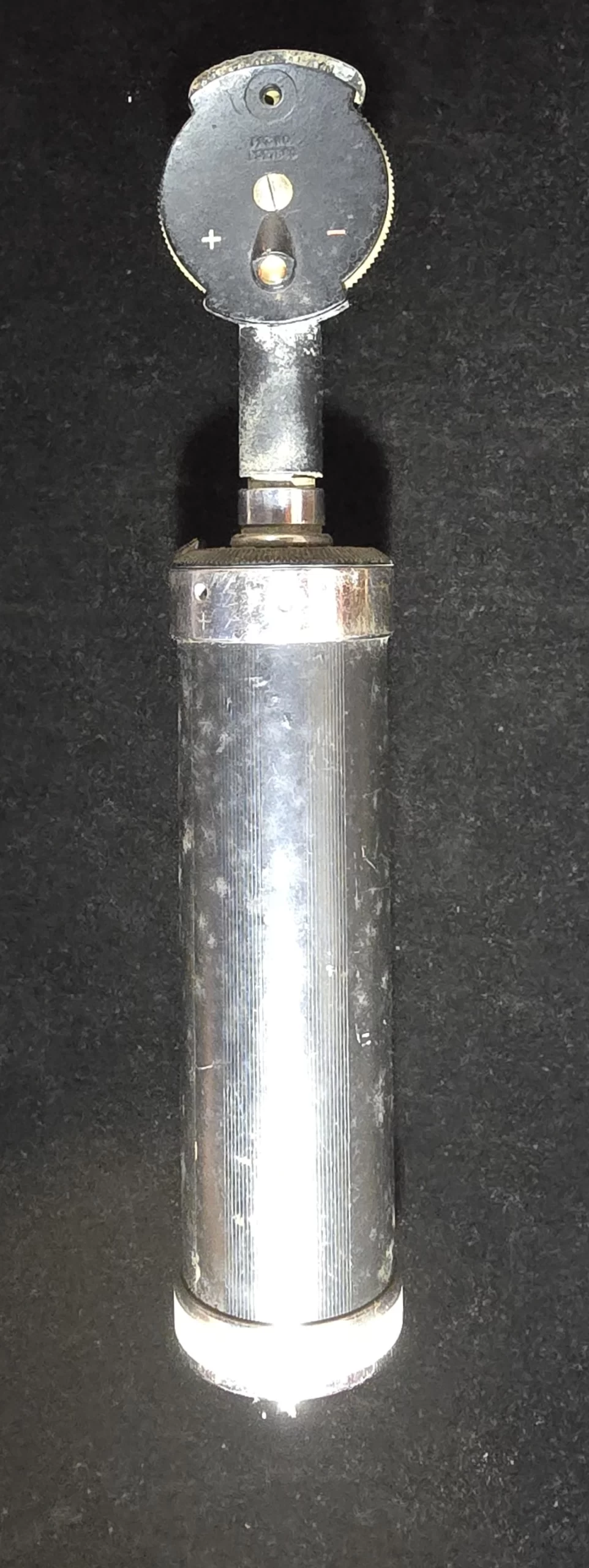 This preserved combination of handle and ophthalmoscope offers a complete glimpse into a physician’s portable diagnostic toolkit. It embodies both technological innovation and practical utility in a form rarely preserved with both pieces still together. It represents not just a tool, but a hands-on connection to everyday diagnostic medicine in the early 20th century.