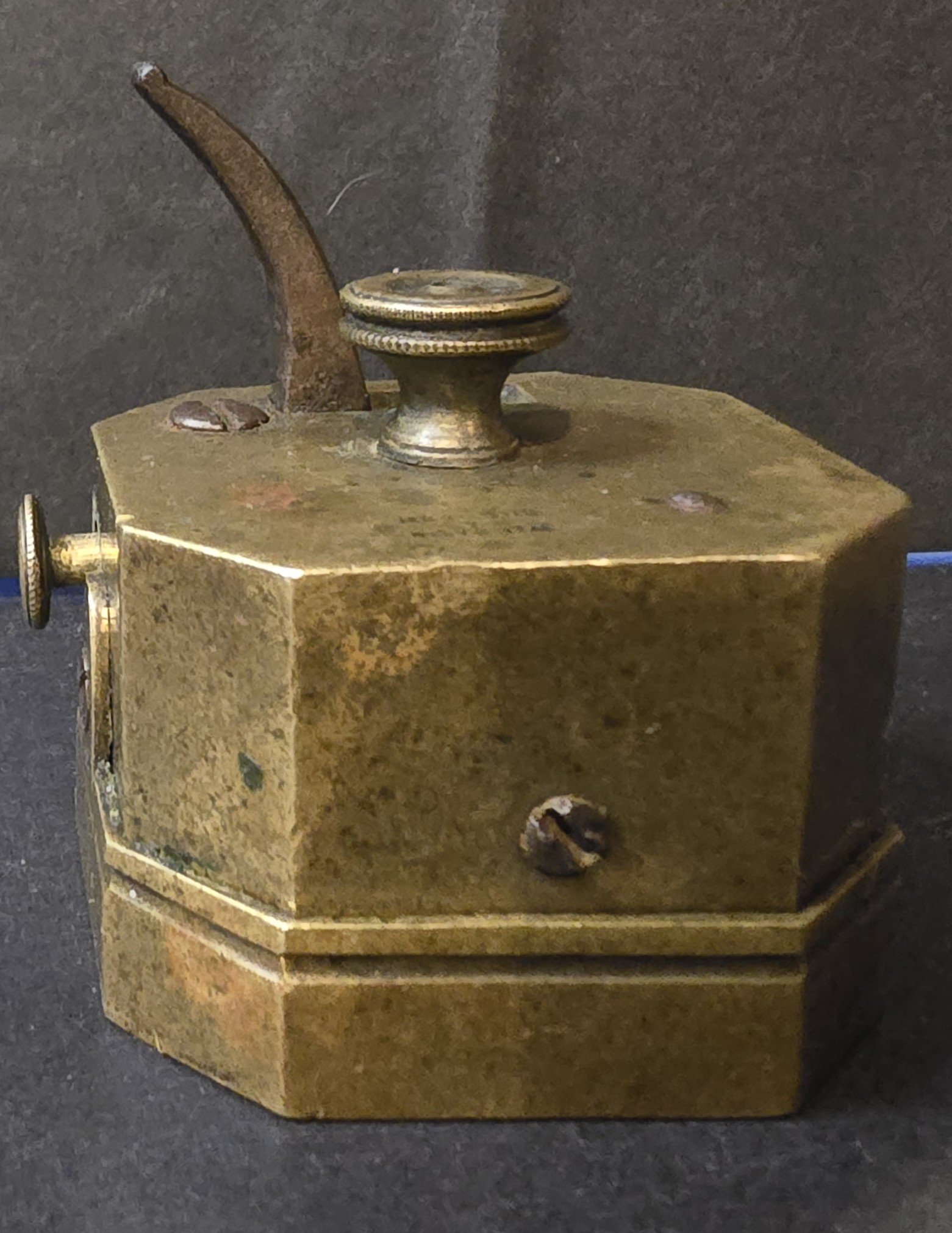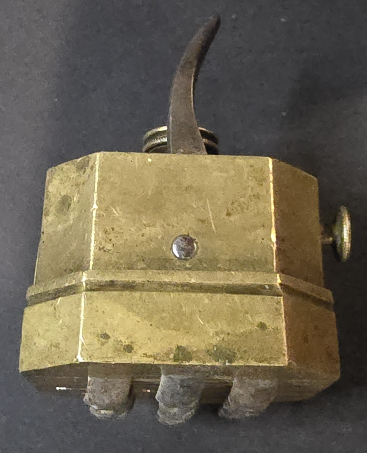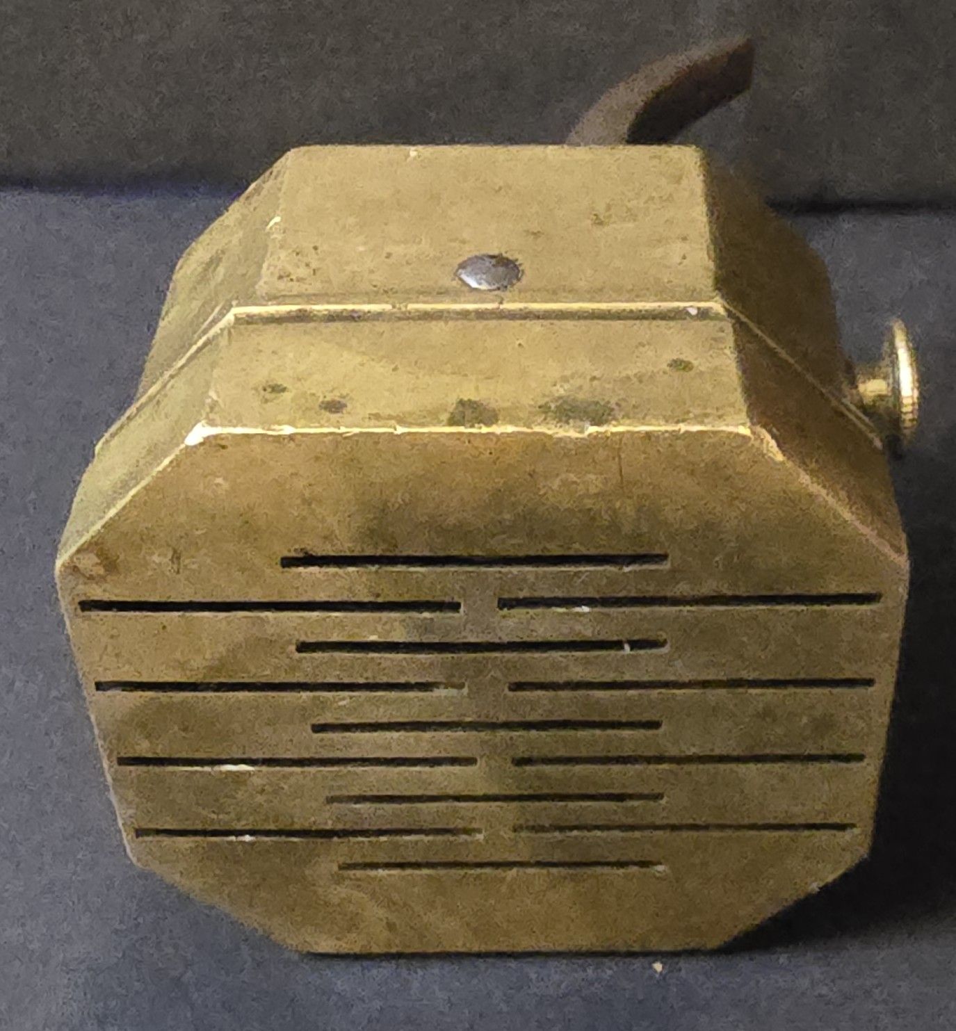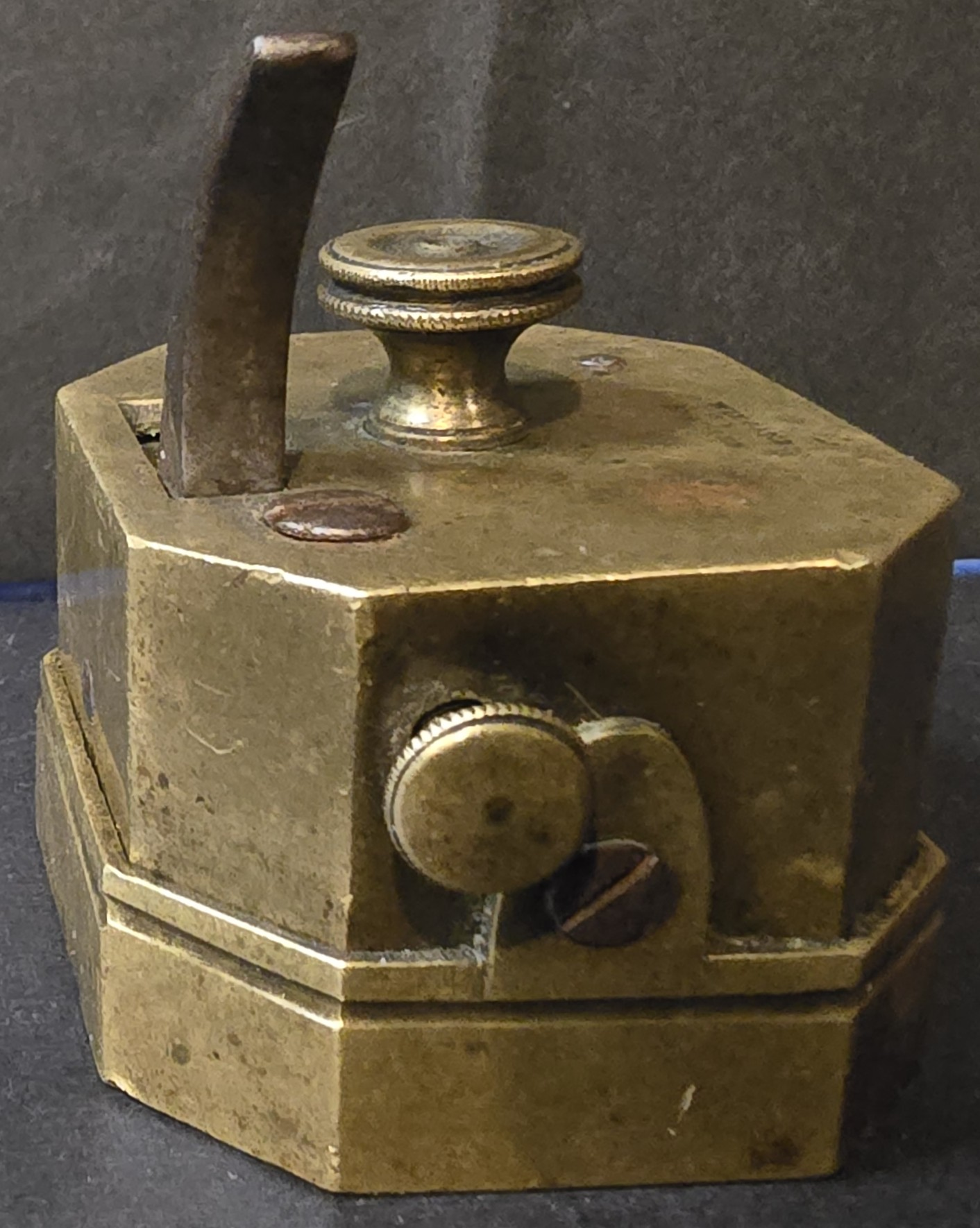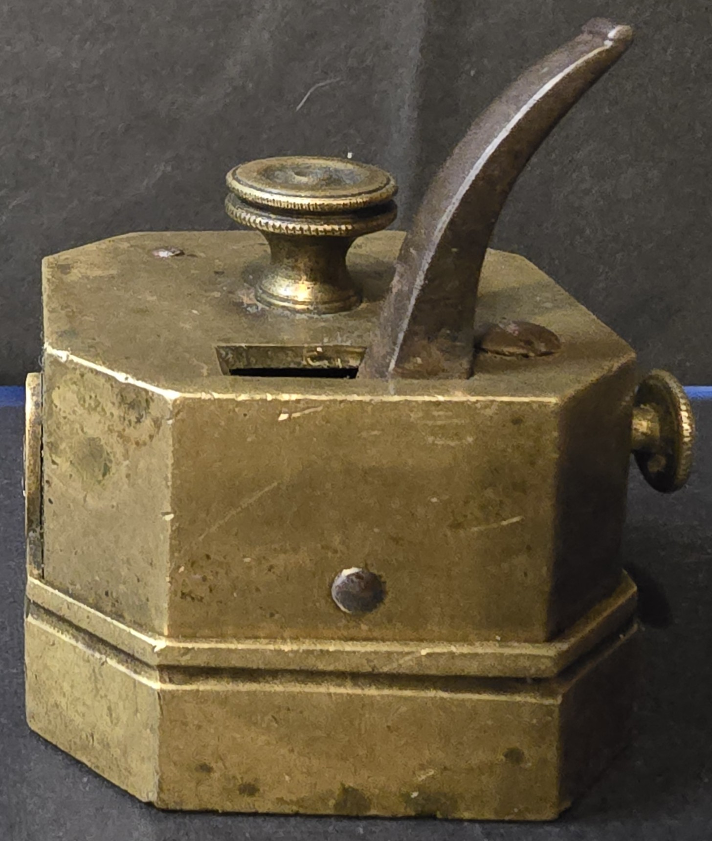 Good. Solid brass body with intact lever mechanism. Age-appropriate oxidation and patina present. No evidence of modern polishing or restoration. Blade mechanism untested but housing remains complete and structurally sound.