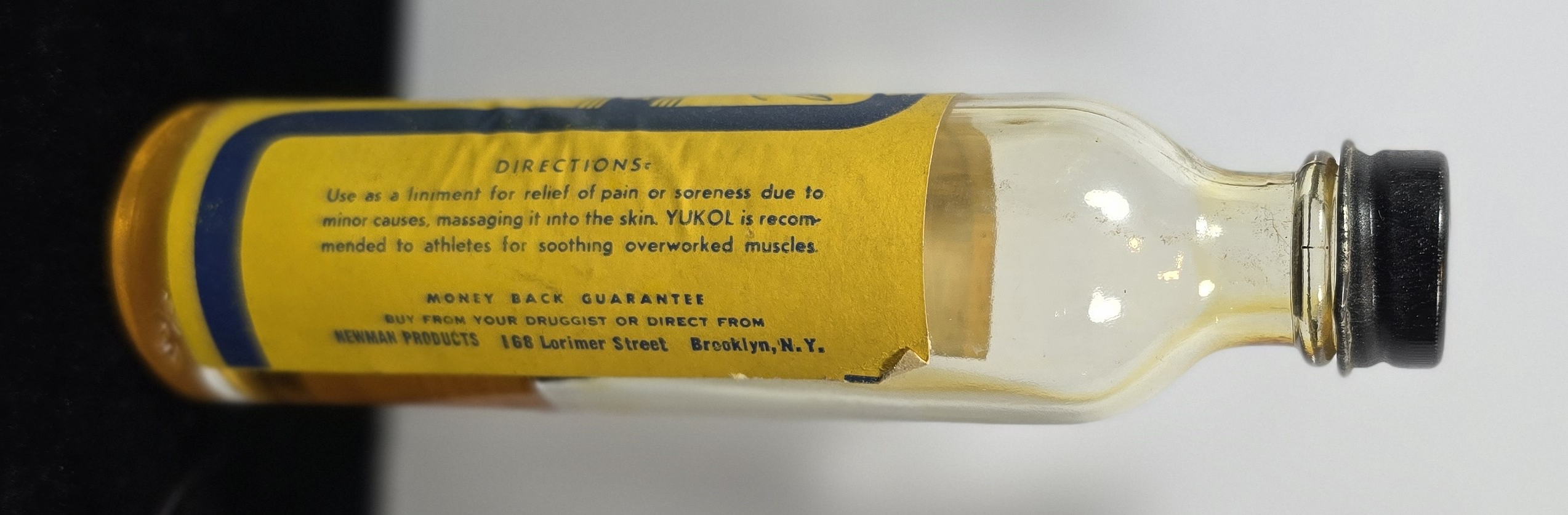 “Use as a liniment for relief of pain or soreness due to minor causes, massaging it into the skin. YUKOL is recommended to athletes for soothing overworked muscles.”
