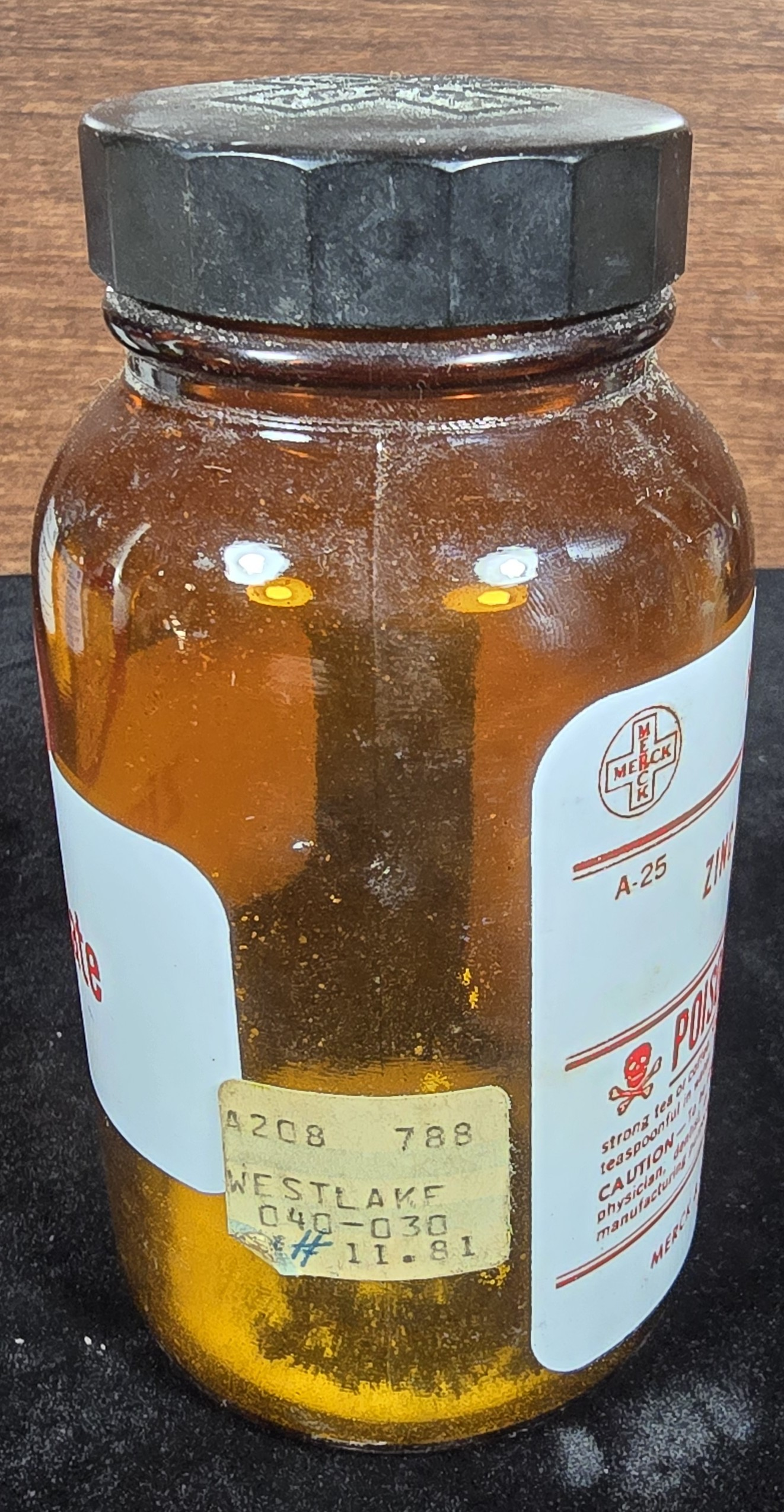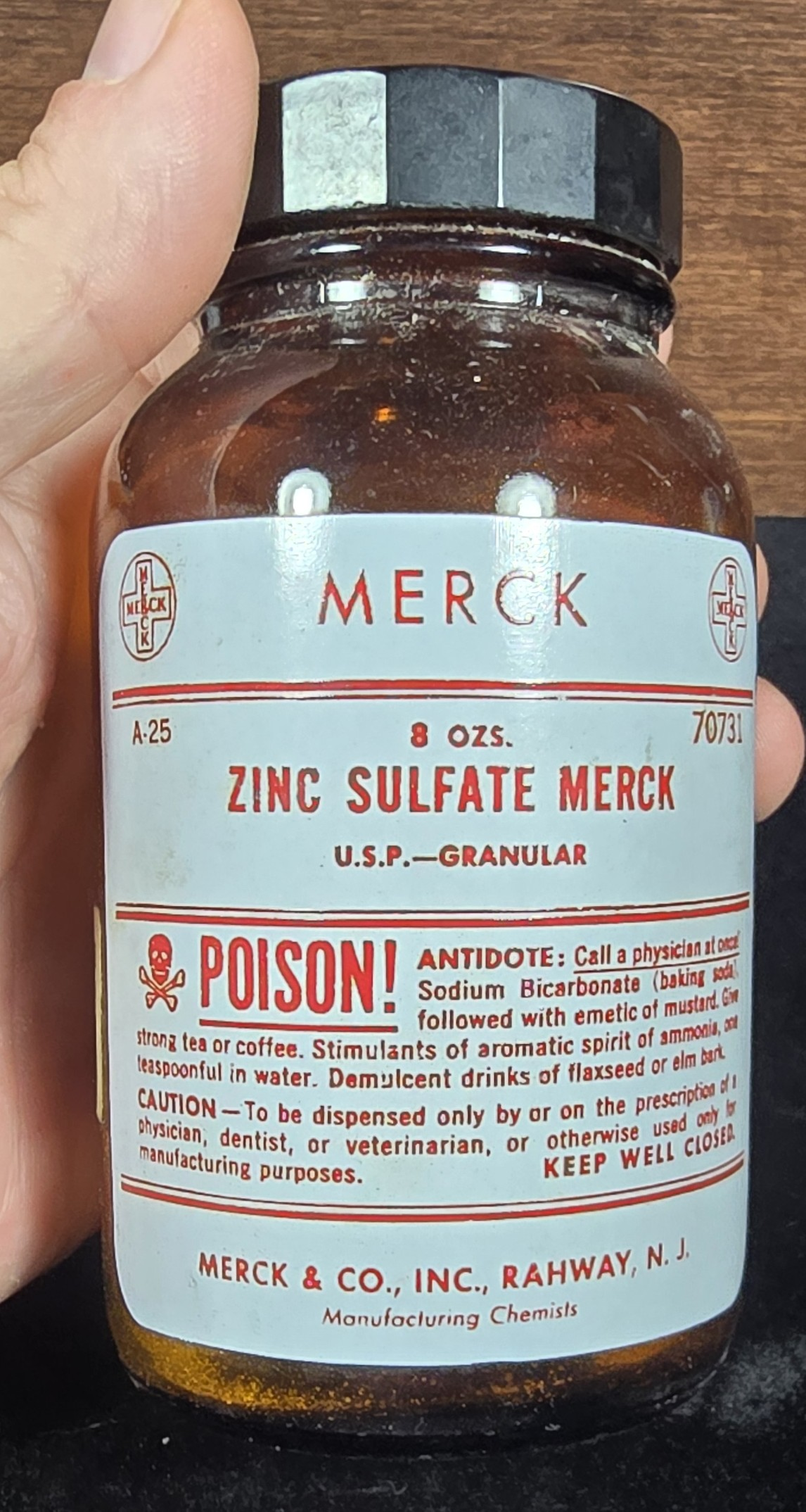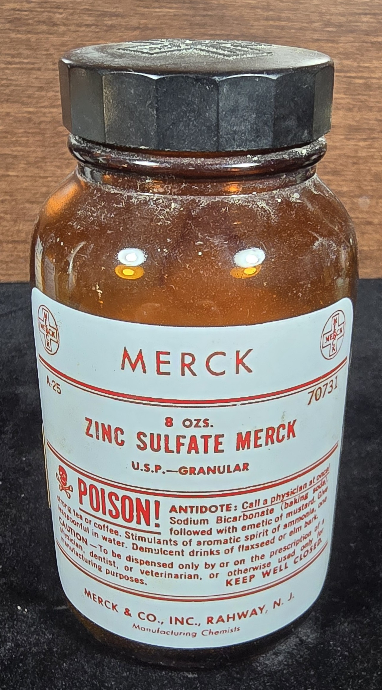 This amber glass pharmaceutical bottle from Merck & Co., Inc. contains granular zinc sulfate (U.S.P. grade) and holds 8 ounces of material. The bold red and white label warns emphatically: “POISON!”, and provides antidote instructions involving sodium bicarbonate, emetic of mustard, and various stimulants or demulcents.