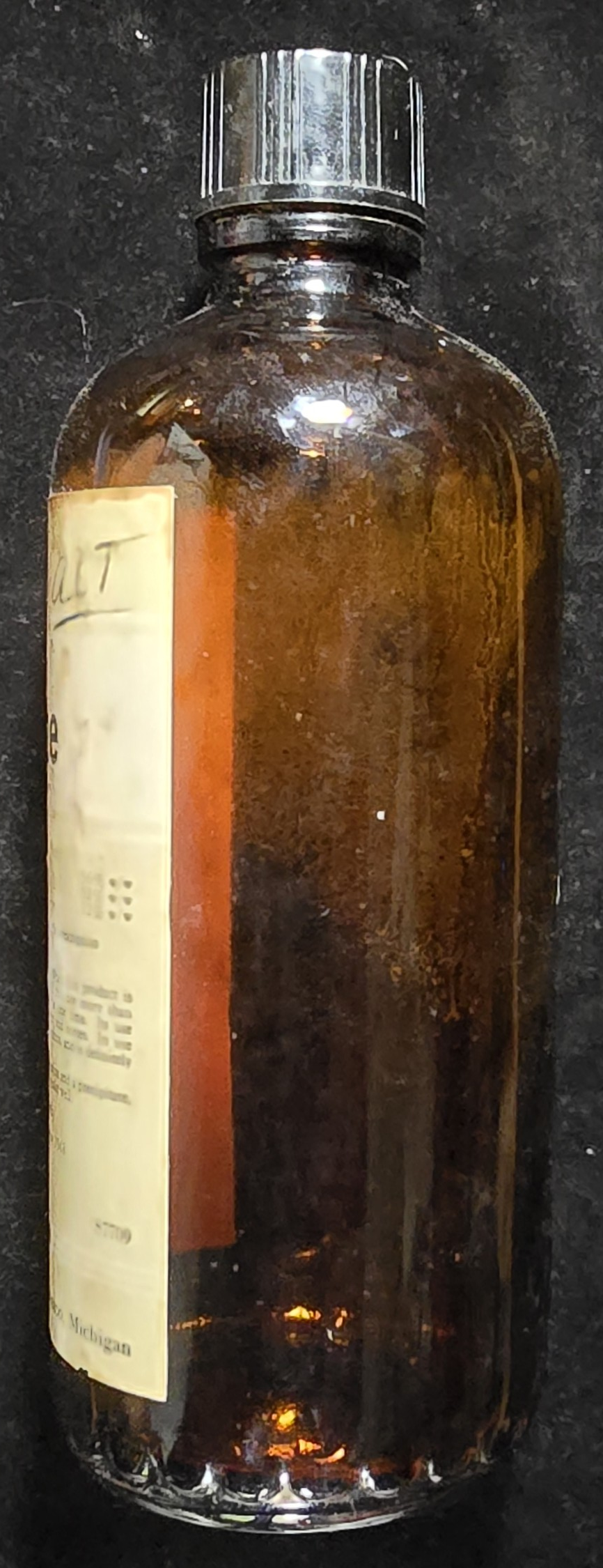 Excellent. The amber glass is intact with a metal screw cap, and the label is clearly legible with only minor discoloration and edge wear. The bottle appears unused, with no visible residue.