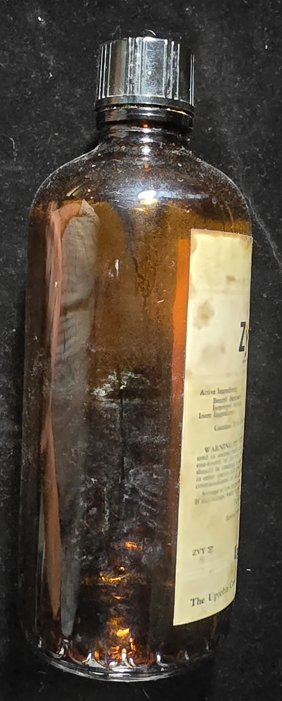 This amber glass bottle of Zylate, manufactured by The Upjohn Company of Kalamazoo, Michigan, is a preserved example of a mid-20th-century veterinary topical preparation. The product is labeled for external use only, with a revised formula dated January 1948. Zylate contains benzyl benzoate and isopropyl alcohol, both known for their antiseptic and antiparasitic properties.